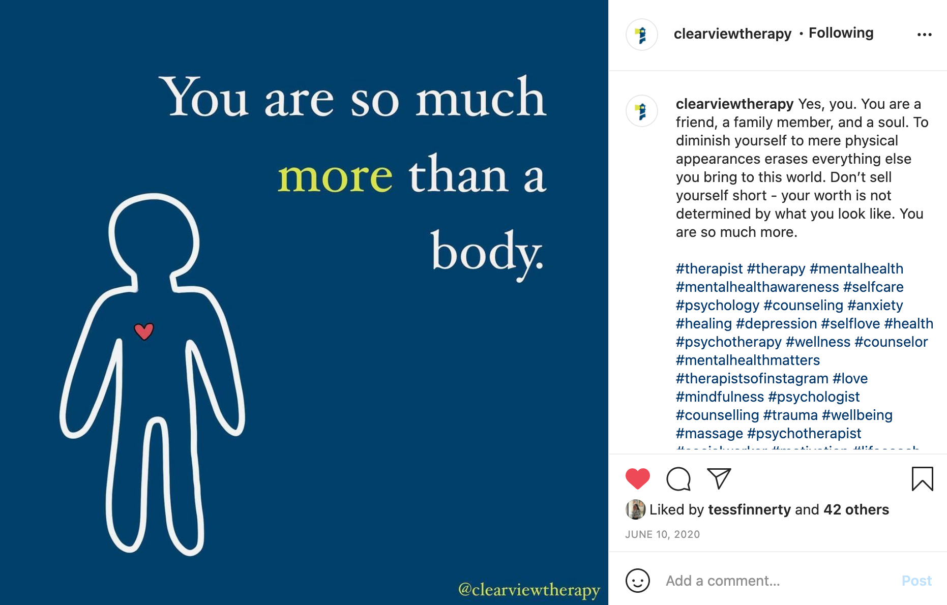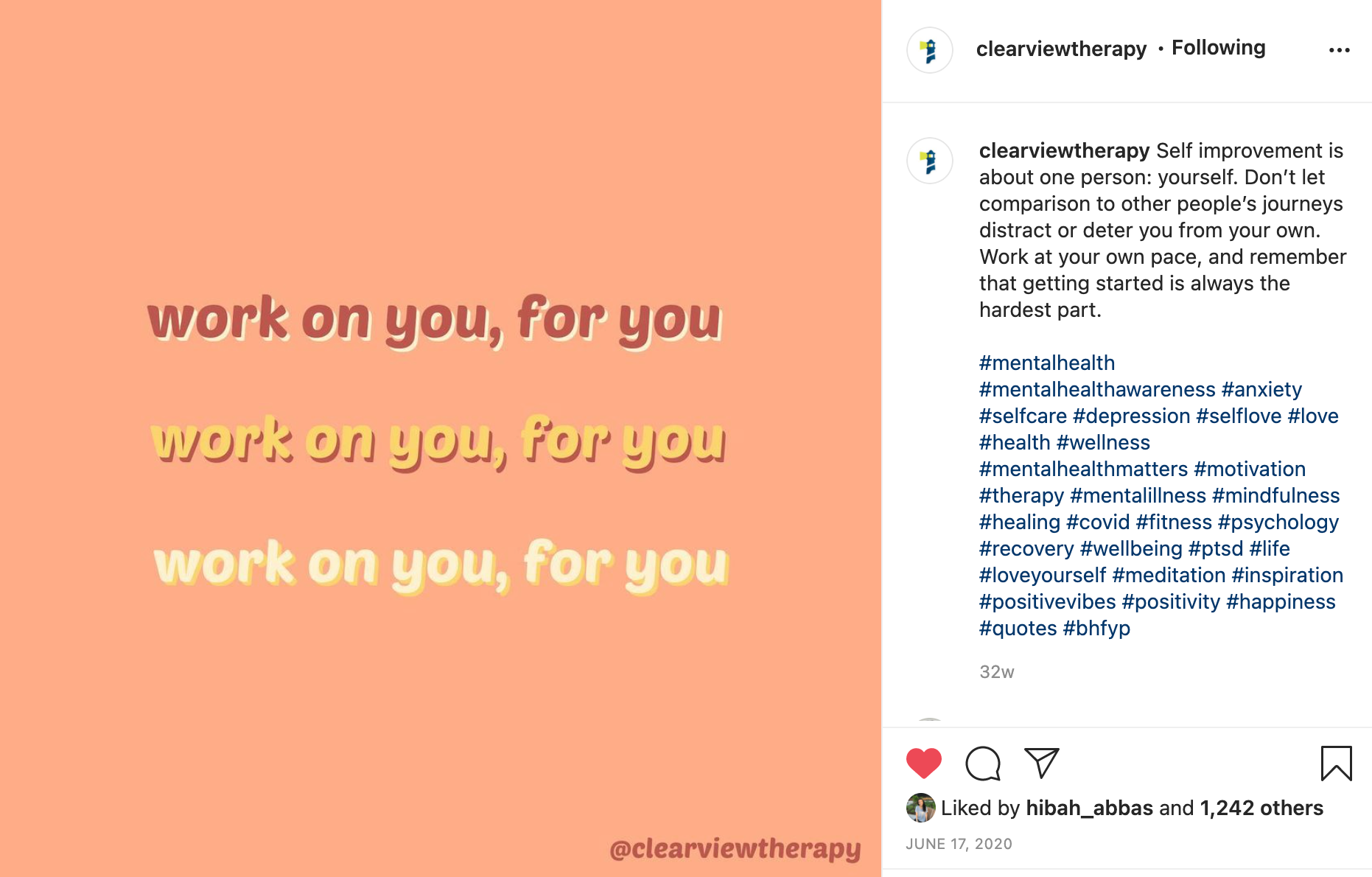 As an intern for Clearview Counseling (a therapy practice for patients ranging from children to young adults), I designed social posts, drafted captions, and wrote website copy. The experience required me to learn more about psychology in order to ensure the tone of the content was as informational and sensitive as possible. I really enjoyed doing this research and have found ways to apply it to both advertising and daily life.